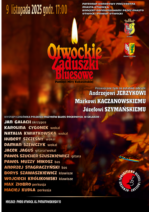 Otwockie Zaduszki Bluesowe, XX edycja, koncert tradycyjnie poświęcony tym co ostatnio odeszli, w tym roku Andrzejowi Jerzykowi i Markowi Kaczanowskiemu - radiowym redaktorom muzycznym i Józefowi Szymańskiemu - propagatorowi bluesa. Koncert specjalny, dwuczęściowy, z muzyką blues-rockową lubianą przez nas i tych co nas opuścili. Wystapią czołowi polscy  muzycy, m.in. Jan Gałach, Karolina Cygonek, Natalia Kwiatkowska, Hubert Szczęsny, Damian Szewczyk, Borys Sawaszkiewicz, Jacek Królikowski, Jacek, Jaguś, Paweł Szucher Szuszkiewicz, Paweł Muzzy Mikosz, Andrzej Stargaczyński, Max Ziobro czy Maciej Kudła. W pierwszej części przedstawią mieszankę znanych nam standardów blues-rockowych a w drugiej  głównie repertuar zespołu  Allman Brothers Band. W przerwie tradycyjnie wystawa, herbata, kawa i rogale marcińskie. Zapraszamy.