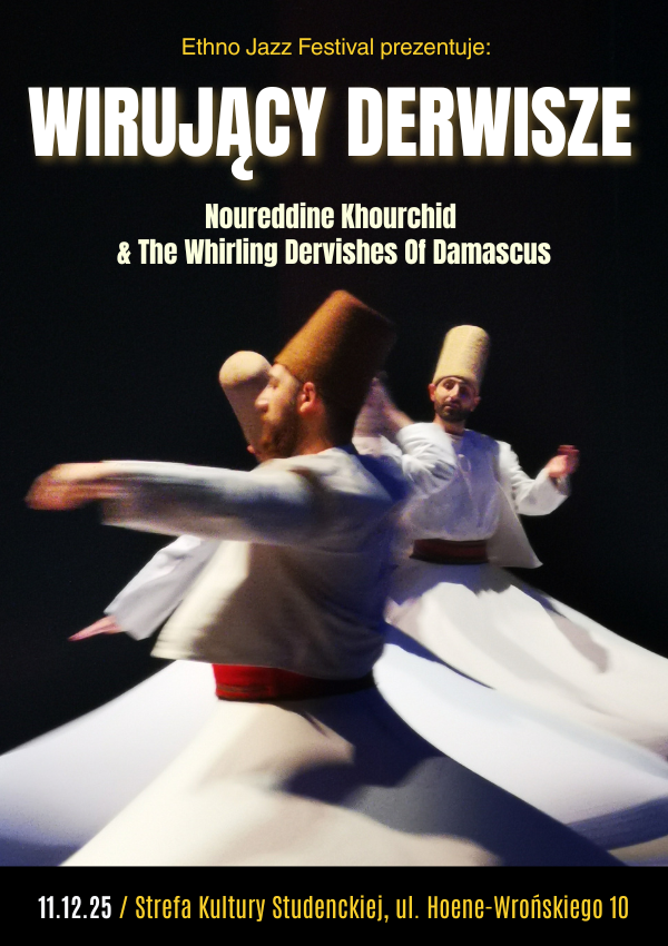 Ethno Jazz Festival ma zaszczyt zaprosić na niezwykły mistyczny spektakl WIRUJĄCYCH DERWISZY z DAMASZKU. Występ pochodzących z Syrii Wirujących Derwiszy z bractwa Mawlawi, z gościnnym udziałem wybitnego koranicznego śpiewaka Noureddine Khourchida, odbędzie się 11 grudnia w sali widowiskowej Strefy Kultury Studenckiej przy ul. Hoene-Wrońskiego 10 w kompleksie Politechniki Wrocławskiej.