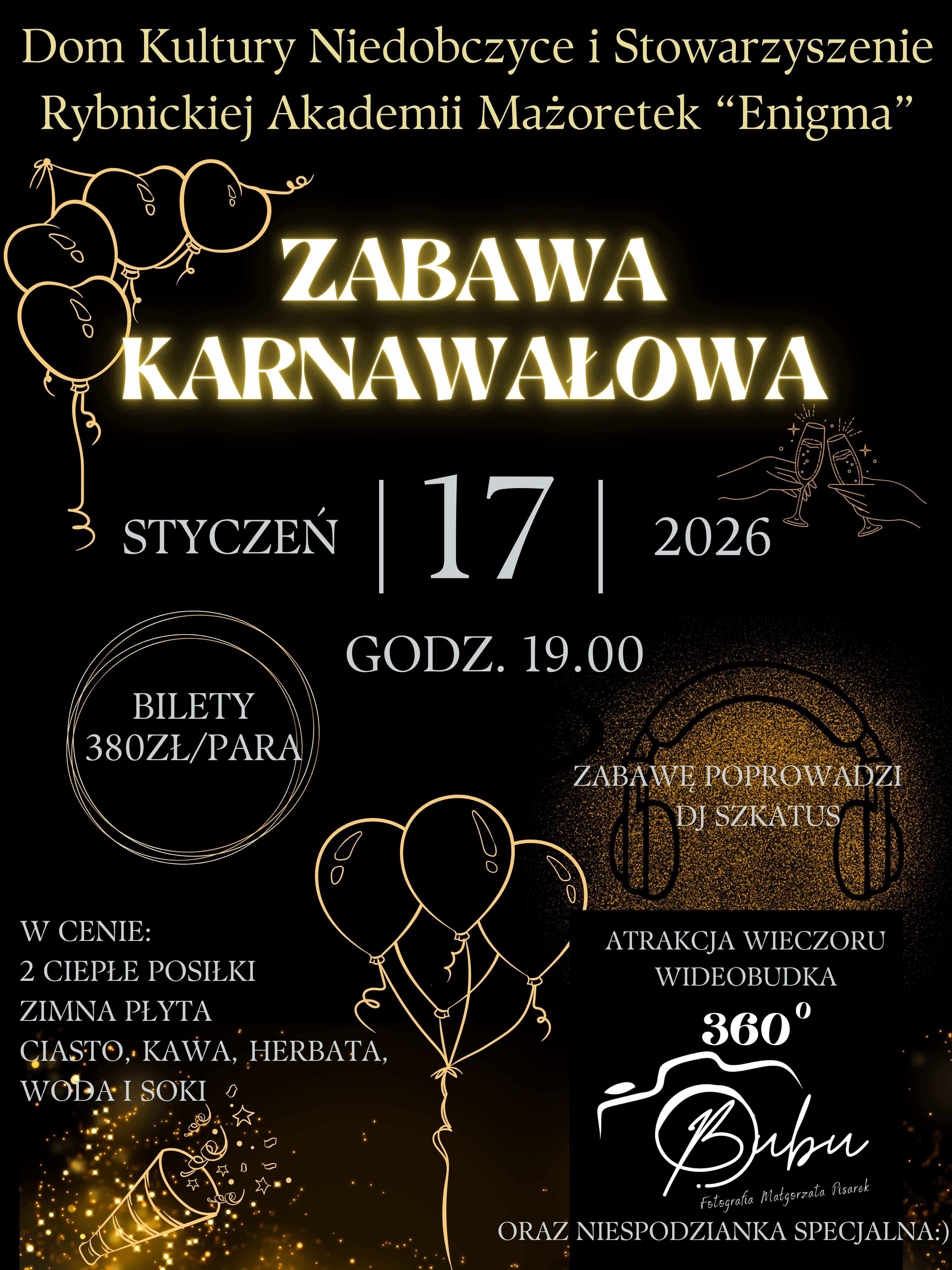 Dom Kultury Niedobczyce w Rybniku wraz ze Stowaryszeniem Rybnickiej Akademii Mażoretek "Enigma" zapraszają do wspólnej zabawy wszystkich rybniczan i nie tylko. Bawimy się 17 stycznia 2026 r. w Domu Kultury Niedobczyce w Rybniku w świetnym towarzystwie rodziców, sympatyków i przyjaciół Rybnickiej Akademii Mażoretek. Imprezę rozpoczynamy o godzinie 19. Zabawę poprowadzi DJ Szkatus.