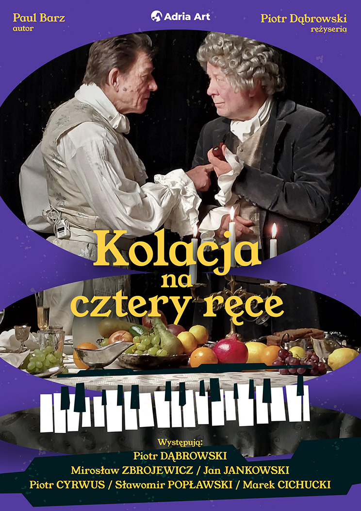 „Kolacja na cztery ręce” to teatralny rarytas dla melomanów i miłośników inteligentnej komedii. Niecodzienna jest sceneria spektaklu: publiczność uczestniczy w autentycznej uczcie i staje się świadkiem – a zarazem uczestnikiem – intelektualnego starcia, w którym dialogi są pełne humoru i ciętego języka.