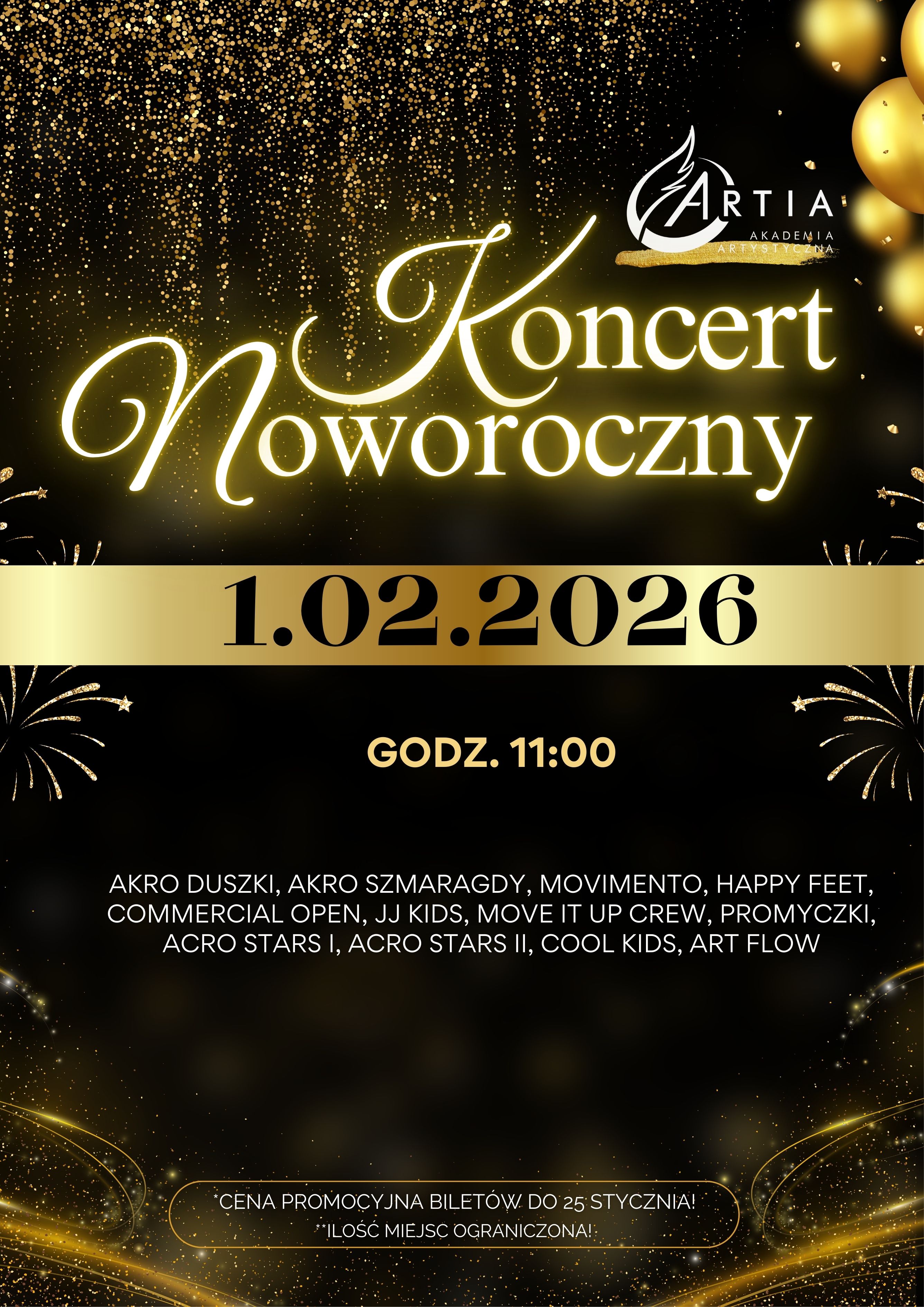 Już 1 lutego 2026 r. odbędzie się Koncert Noworoczny Artia Akademii Artystycznej! Dzieci i młodzież zaprezentują swoje talenty na scenie Jarocińskiego Ośrodka Kultury. Wszyscy uczestnicy otrzymają brawa i upominki, które będą pamiątką tego wyjątkowego wydarzenia.