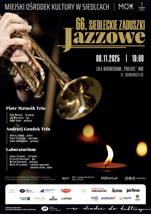 Już 8 listopada w sali widowiskowej „Podlasie” odbędzie się 66. edycja Siedleckich Zaduszek Jazzowych – największej i najstarszej imprezy jazzowej w naszym regionie, mającej blisko siedemdziesięcioletnią tradycję. To jedno z najważniejszych wydarzeń w kalendarzu naszego Ośrodka oraz kulturalnych wizytówek miasta, które od lat gromadzi melomanów i miłośników dobrej muzyki z całej Polski.