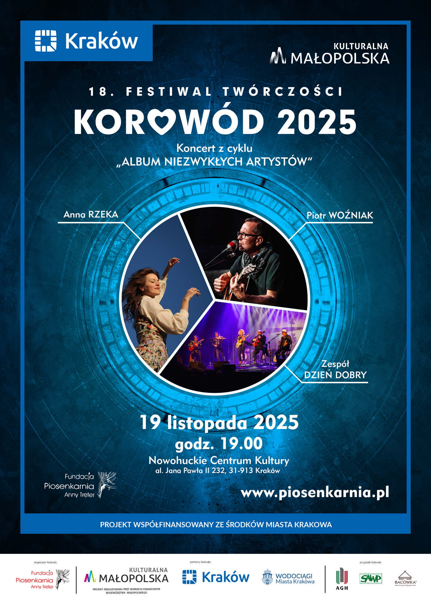 Muzyczny wieczór rozpocznie występ Anny Rzeki – młodej wokalistki i autorki, której twórczość łączy poetycki przekaz z subtelną wrażliwością muzyczną. Artystka jest laureatką konkursu (2024r) organizowanego corocznie w ramach Festiwalu Twórczości KOROWÓD. Podczas koncertu zaprezentuje swoją nagrodzoną piosenkę „Księżycu mój” (link: www.youtube.com/watch?v=BzO5N_fcgC4) oraz autorskie utwory „Niebo”