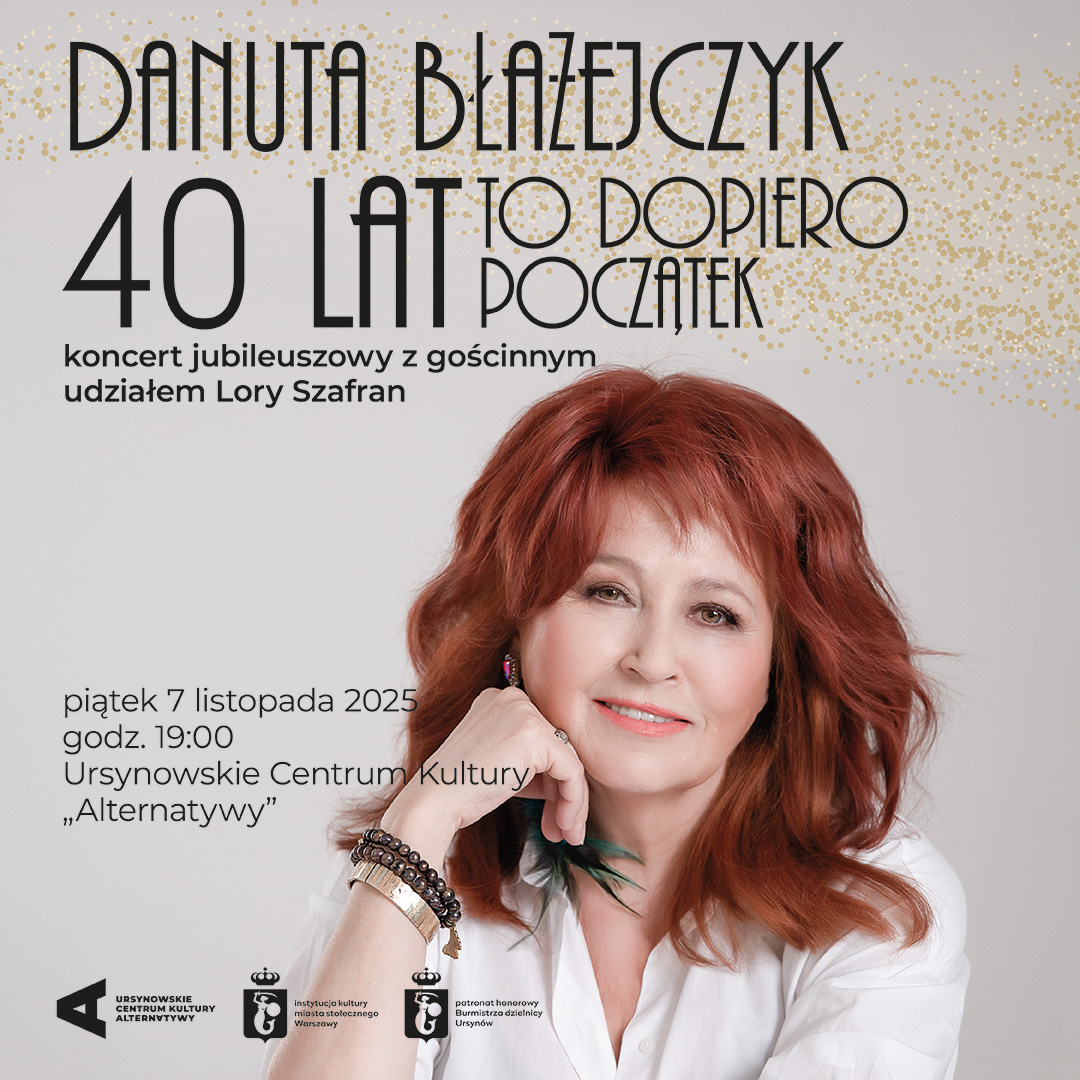 Danuta Błażejczyk – charyzmatyczna wokalistka o niepowtarzalnym głosie i czterech dekadach pracy artystycznej – świętuje jubileusz swojej kariery. Od debiutu w Opolu po liczne sukcesy na scenach w kraju i za granicą, jej twórczość łączy jazzową wrażliwość z muzyką rozrywkową, a każda interpretacja wyróżnia się pasją i emocjonalnością. Gościem specjalnym wieczoru będzie Lora Szafran, wybitna wokalistka jazzowa, której elegancja i muzykalność dodadzą koncertowi wyjątkowego blasku. Całości dopełni zespół pod dyrekcją Andrzeja Perkmana, gwarantując najwyższy poziom artystyczny i niezapomnianą oprawę muzyczną. To będzie wieczór pełen wzruszeń, wspomnień i radości, który udowodni, że 40 lat to naprawdę dopiero początek.