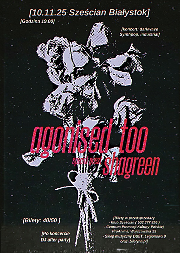 Melancholia ponad wszystko, ale nie wyłącznie. Agonised Too powstał w 2022 jako projekt przyjaciół, którzy od lat chcieli tworzyć piosenki razem. Bartosz Hervy - artysta audio-wizualny i Rafał Tomaszczuk - wokalista i autor tekstów rozpoczęli od epki "First Track", która ukazała się pod koniec 2022 roku. Była ona odzwierciedleniem ich zamiłowania do smutnej muzyki elektronicznej. Sięgając po new romantic, synthpop czy darkwave oddali to, co wtedy czuli pod skórą. Rok 2023 to 3 single z nowymi utworami, a lato 2024 należało do nich! W czerwcu ukazała się debiutancka płyta "Summer Suffering". Tym razem duet wkroczył w rejony elektroniczno popowej stylistyki, przywołując tym samym wspomnienia z lat osiemdziesiątych.