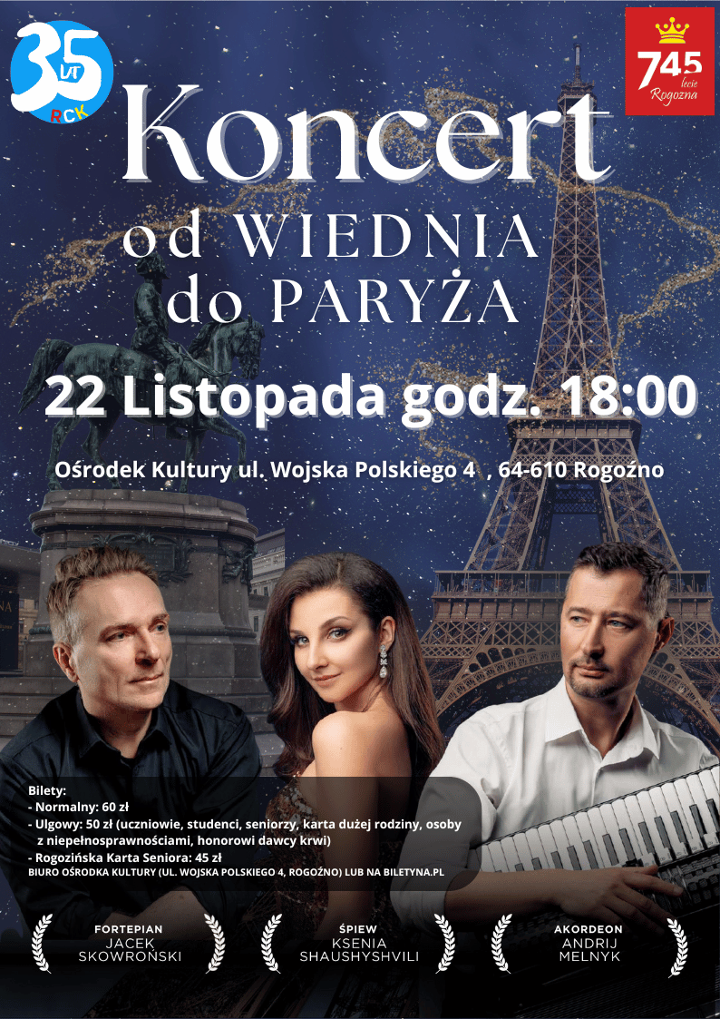 W magicznej atmosferze usłyszymy pełne emocji arie, walce i melodie prosto z Wiednia i Paryża. Na scenie wystąpią: Ksenia Shaushyshvili (śpiew), Jacek Skowroński (fortepian) oraz Andrij Melnyk (akordeon).
