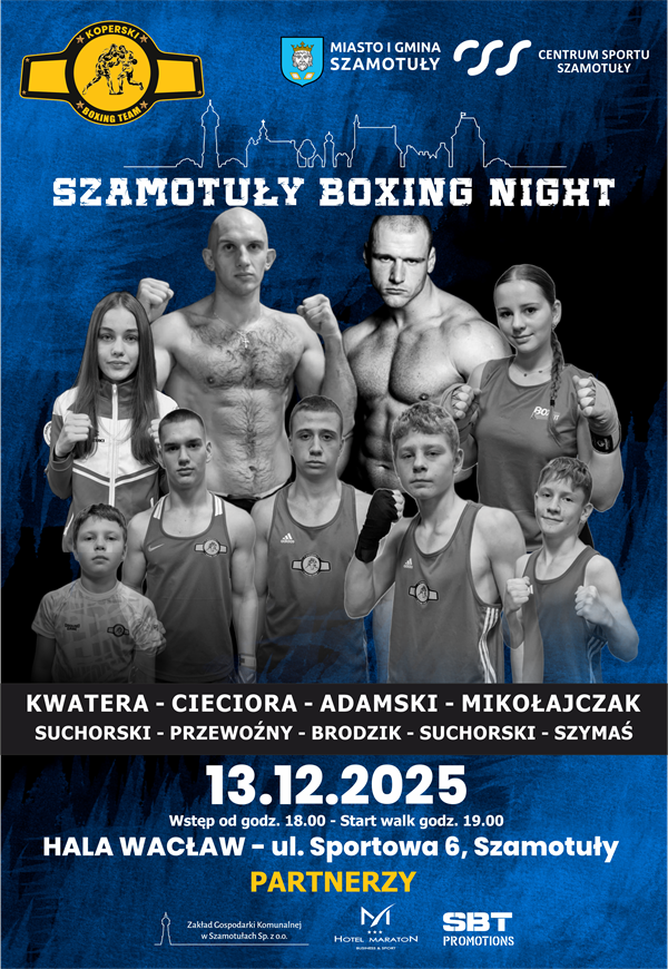 Już 13 grudnia „Szamotuły Boxing Night” – gala boksu olimpijskiego. W ringu zobaczymy reprezentantów lokalnego klubu Koperski Boxing Team, a wśród nich świeżo upieczona medalistka Mistrzostw Europy Młodziczek – Lena Kwatera, medaliści Mistrzostw i Pucharu Polski Antonina Mikołajczak, Wiktor Brodzik i Oskar Suchorski, a także ćwierćfinalista Mistrzostw Polski Jan Szymaś. W walce wieczoru zobaczymy seniorski boks w wadze ciężkiej i super ciężkiej, a w niej ulubieńcy szamotulskiej publiczności Paweł Cieciora i Jakub Adamski. Impreza współorganizowana przez Koperski Boxing Team, Miasto i Gminę Szamotuły oraz Centrum Sportu Szamotuły. Wejście na halę od godz 18:00, start walk 19:00 Zapraszamy