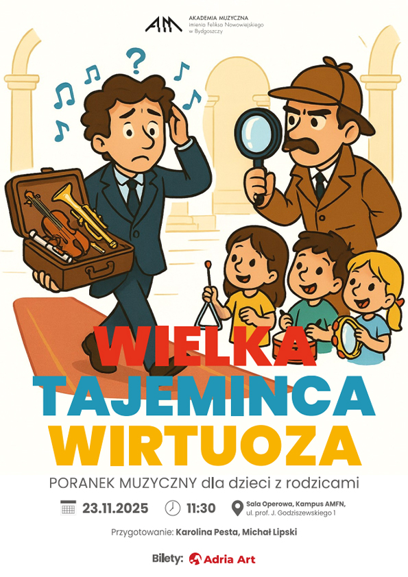 Poranki muzyczne powracają w zupełnie nowej odsłonie! To niezwykła podróż w świat dźwięków, zabawy i zagadek, gdzie dzieci wraz z rodzicami stają się prawdziwymi detektywami muzyki. Każde spotkanie to nowa tajemnica do rozwiązania, pełna śmiechu, ruchu i wspólnego muzykowania. Akademia Muzycznych Zagadek to idealny sposób, by połączyć naukę z przygodą i odkryć magię instrumentów w bajkowej atmosferze.