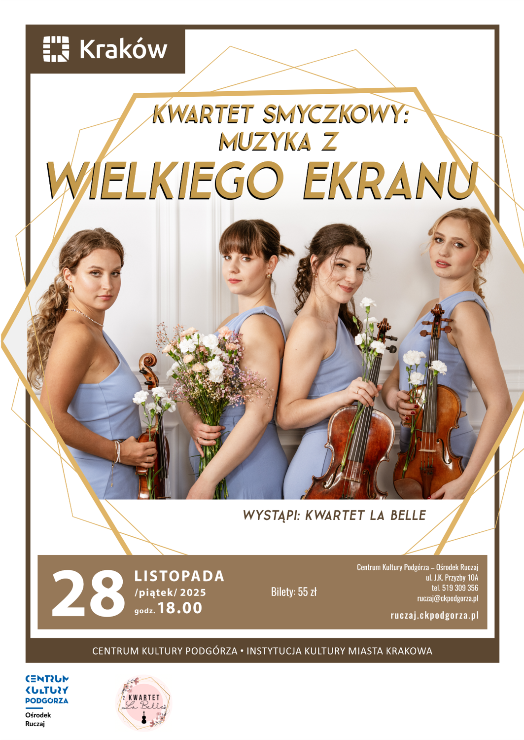 Wyjątkowy wieczór z najpiękniejszymi melodiami ze świata kina w kameralnym, smyczkowym brzmieniu. W programie utwory z kultowych filmów, które poruszają emocje i przywołują niezapomniane filmowe wspomnienia. Nastrojowe aranżacje, klimatyczne światło i bliski kontakt z muzyką tworzą atmosferę pełną magii, wzruszeń i elegancji. Idealna propozycja dla miłośników muzyki i kina – spotkanie z dźwiękiem, który opowiada historie.