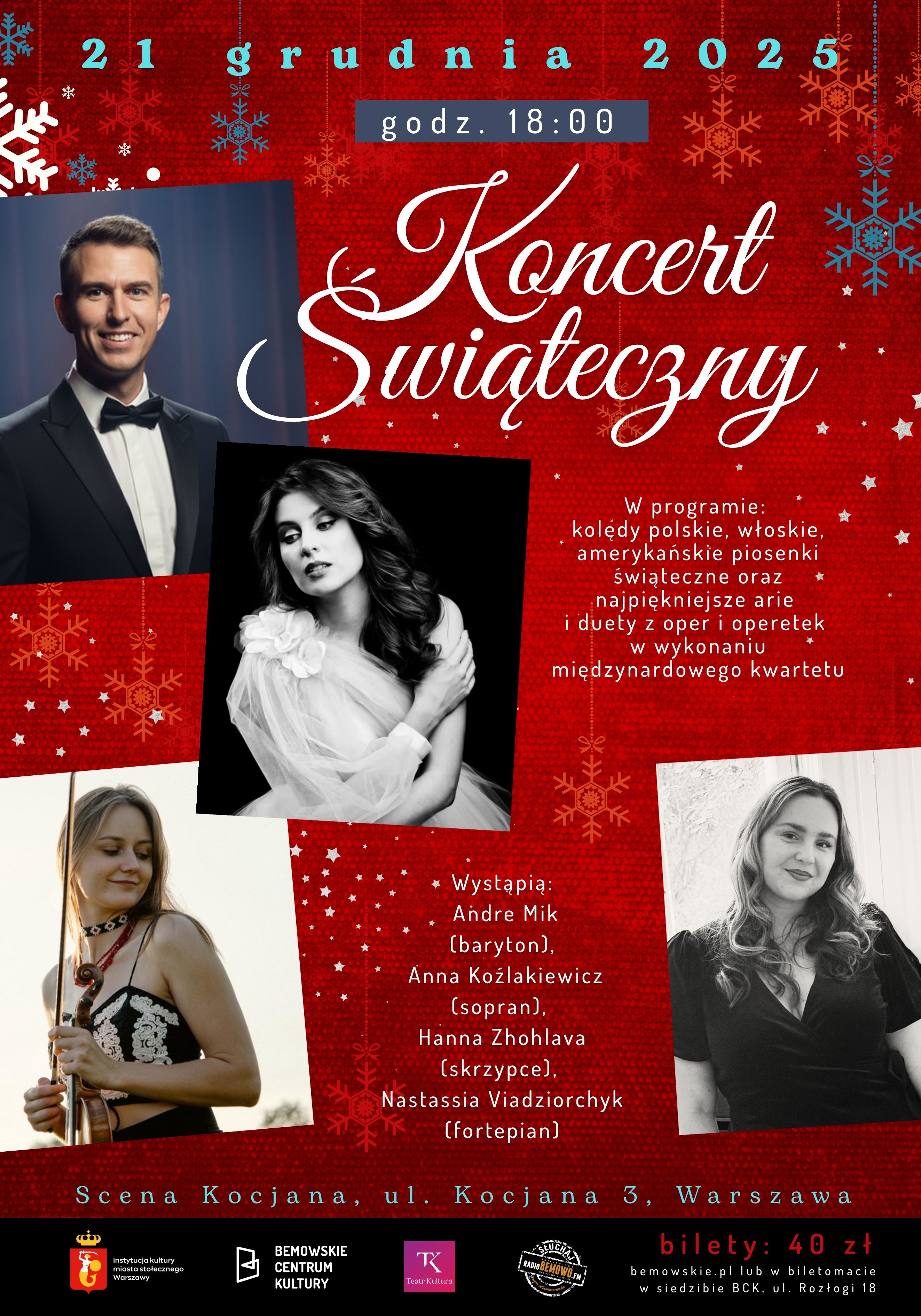 Zapraszamy na wyjątkowy Koncert Świąteczny – pełen emocji, muzycznej elegancji i świątecznej atmosfery. Wydarzenie odbędzie się w wykonaniu międzynarodowego kwartetu artystów, którzy przygotowali program łączący klasykę z najpiękniejszymi świątecznymi tradycjami.