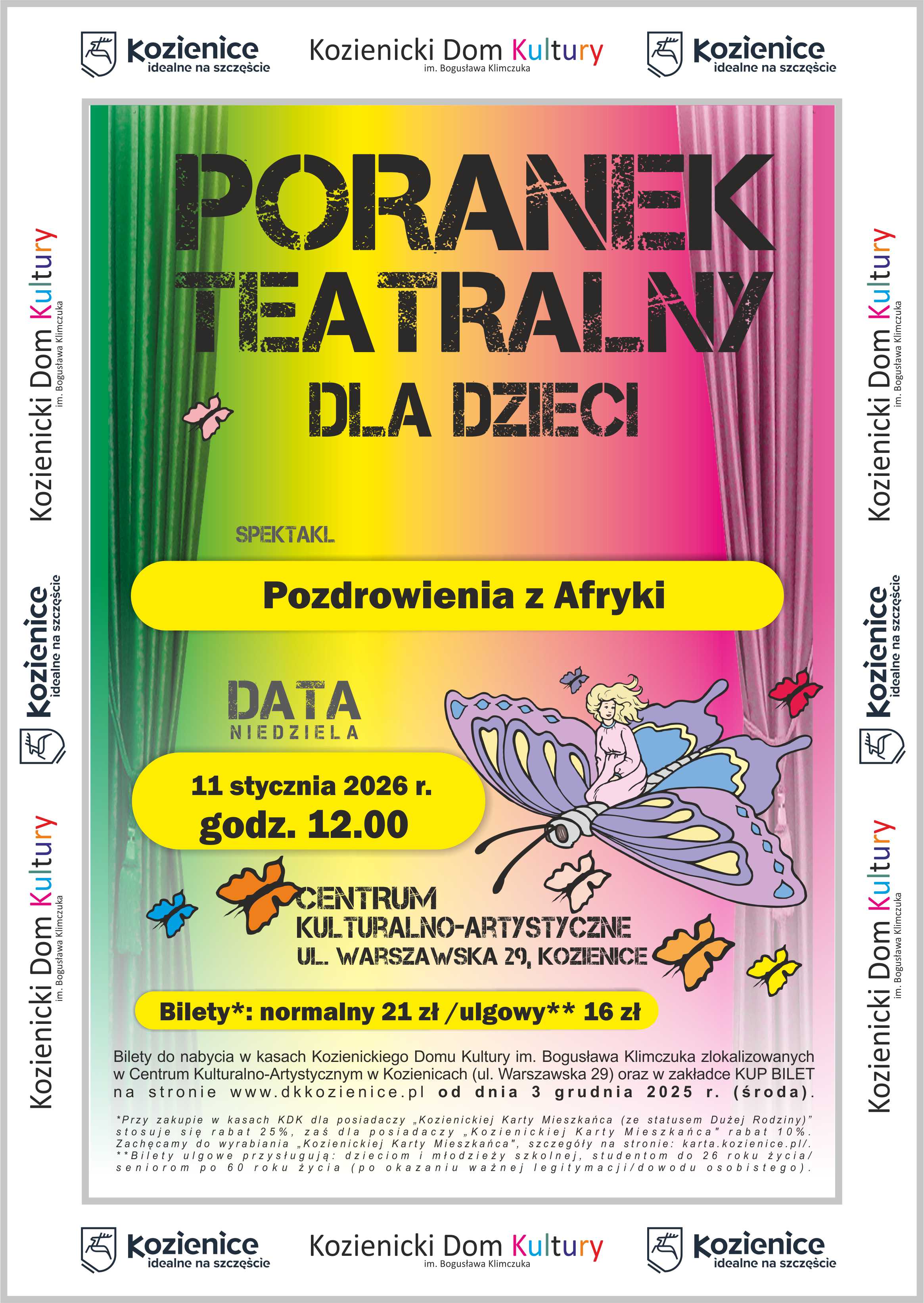 „Pozdrowienia z Afryki” to przedstawienie, które pokazuje, jak wiele możemy się nauczyć, podróżując po świecie. Gdy w wiejskiej gospodzie wszystkie zwierzęta są już gotowe na zimę, Pani Gospodarz otrzymuje kartkę z Afryki, zapowiadającą odwiedziny Pani Flaming. Niestety główna bohaterka niewiele wie na temat Polski. Z pomocą przybywa świnka Chrumka, która okazuje się jej daleką kuzynką.