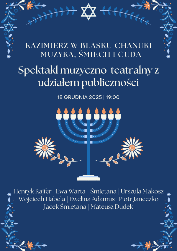 Kazimierz w Blasku Chanuki to pełen ciepła i humoru muzyczno-teatralny spektakl, w którym tradycyjne pieśni, opowieści i żydowskie anegdoty przeplatają się z udziałem publiczności.