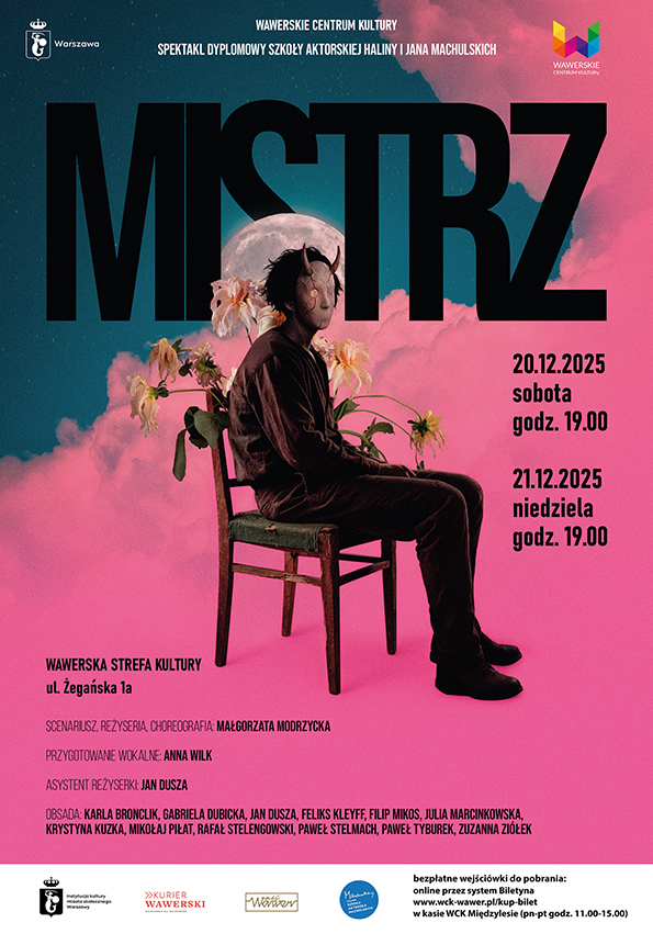 Zapraszamy na spektakl dyplomowy, „Mistrz”, który zaprezentują studenci Szkoły Aktroskiej im. Haliny i Jana Machulskich 20 i 21 grudnia w Wawerskie Centrum Kultury (ul