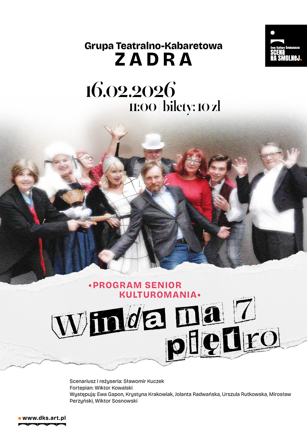 PROGRAM SENIOR – KULTUROMANIA Grupa Teatralno Kabaretowa ZADRA „Winda na 7 piętro” , spektakl Scenariusz i reżyseria, Sławomir Kuczek Fortepian, Wiktor Kowalski Występują, Ewa Gapon, Krystyna Krakowiak, Jolanta Radwańska, Urszula Rutkowska, Mirosław Perzyński, Wiktor Sosnowski
