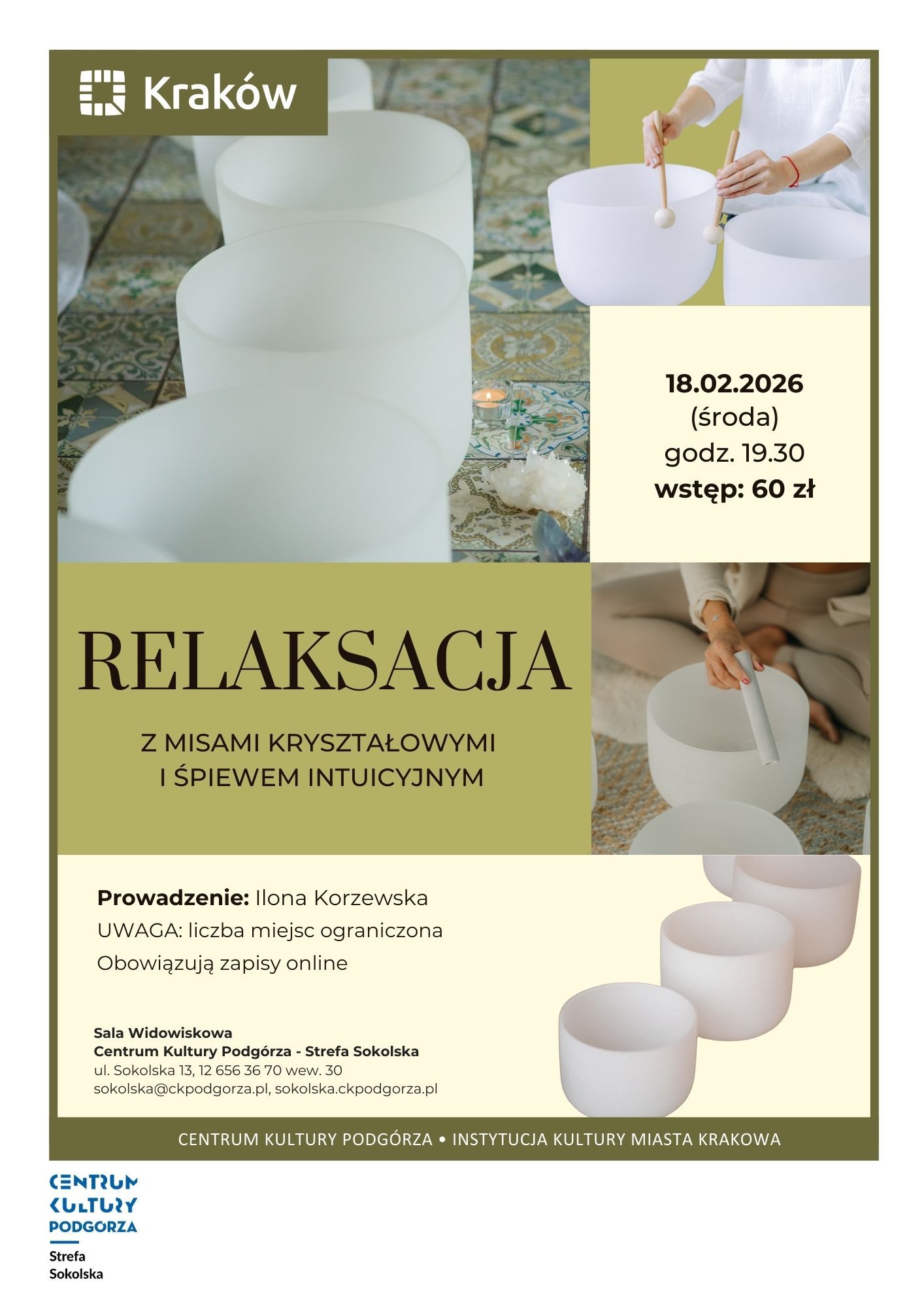 Relaksacja w dźwiękach mis kryształowych i śpiewu intuicyjnego 18.02.2026 - more information