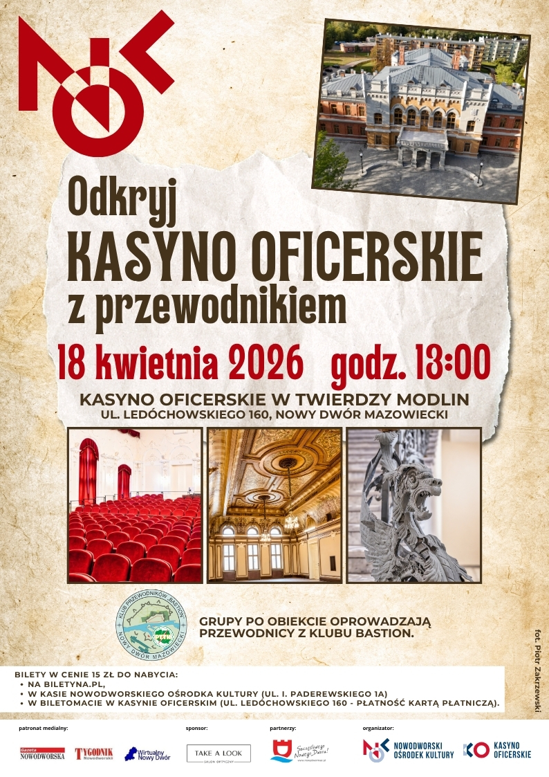 Zapraszamy na wyjątkowe zwiedzanie Kasyna Oficerskiego w Twierdzy Modlin – miejsca z historią, klimatem i niezwykłymi opowieściami. To doskonała okazja, by poznać wnętrza jednego z najpiękniejszych zabytków regionu i usłyszeć fascynujące historie z jego przeszłości.